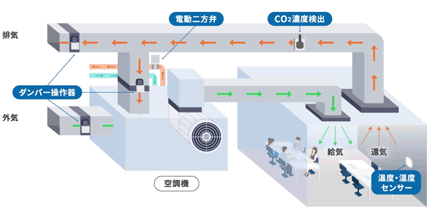 室内の温度や湿度を適切に維持するため、室内温度センサーが環境を監視し、制御装置(電動二方弁やダンパー操作器)がそれに応じて空調機器を調整します。これにより快適な室内環境が維持され、エネルギーの効率的な利用が可能となります。