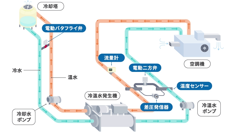 快適な空調を実現するため、熱源制御は空調要求に応じた冷温水の供給量を調整します。流量、熱量、差圧発信器、電動二方弁などを利用し、省エネルギーな制御を行います。冷房時には、熱源制御発生機から排出される温水を冷却塔と電動バタフライ弁で制御し、効率的な冷却を実現します。