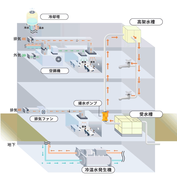 建物の動力制御は、建物内の電力や機械設備を効率的に管理しています。動力制御は、中央監視室から、電力消費の監視、負荷のバランス調整、機器の運転スケジュールの最適化などを行います。これにより、建物のエネルギー効率や運用コストを最適化し、快適性や安全性を確保します。