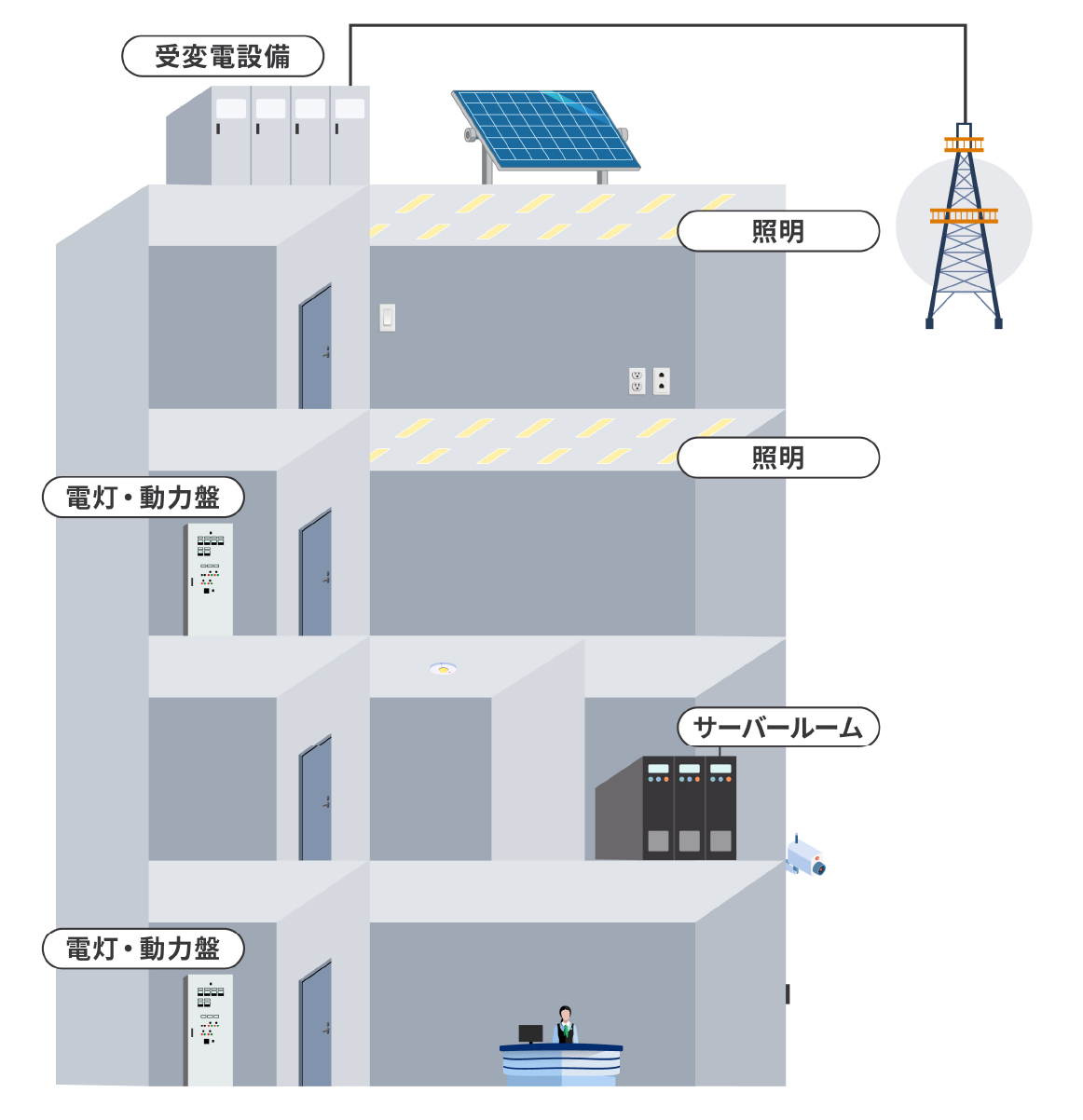 電気設備には、照明、電力供給、配電、発電、制御システムなどが含まれます。中央監視制御はこれらの設備の動作状況をリアルタイムでモニタリングし、データの見える化を行います。